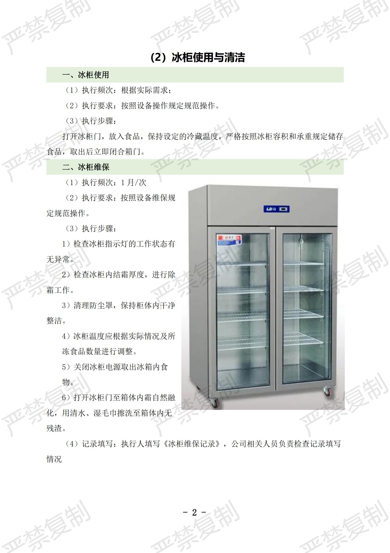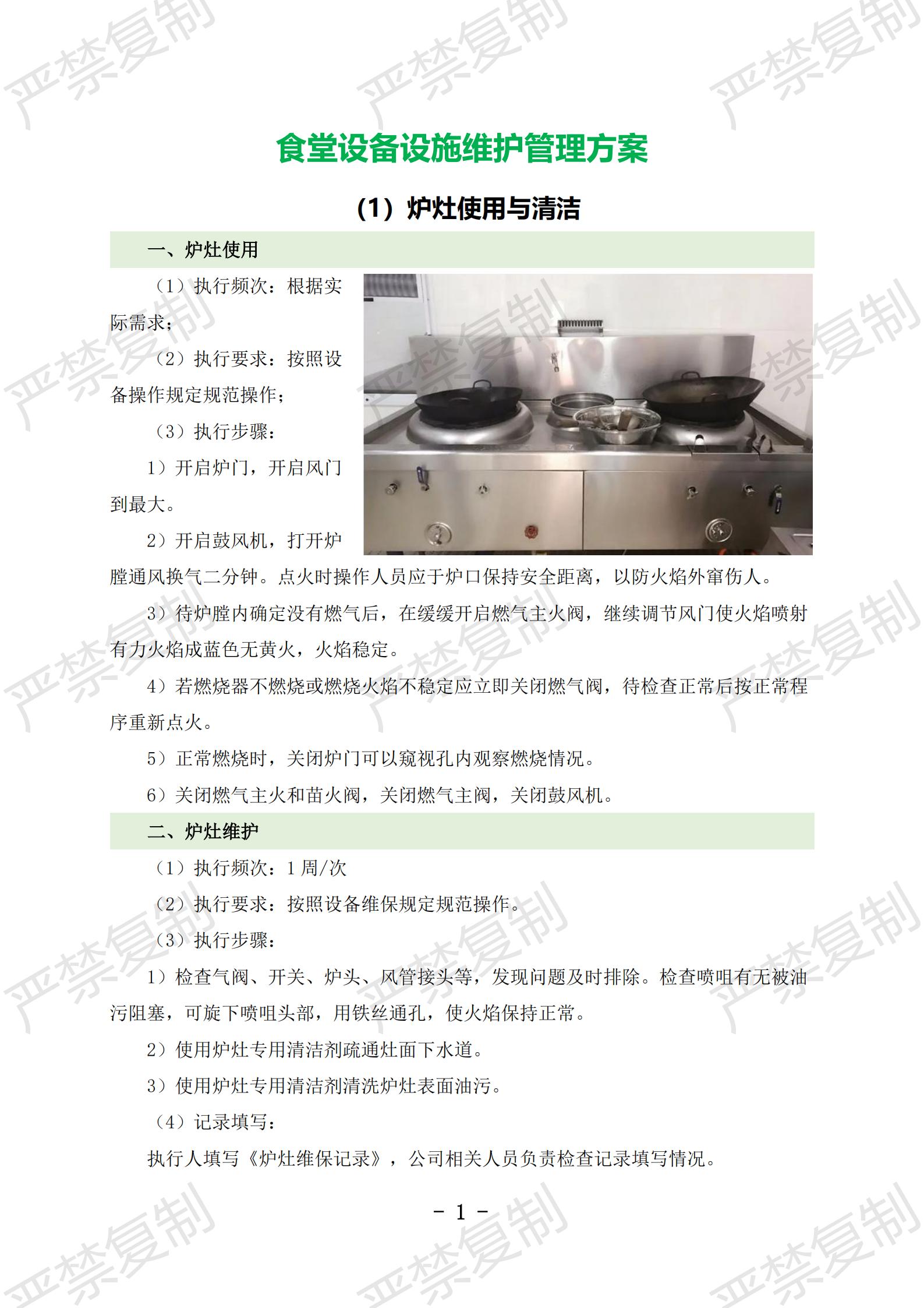 (1)炉灶使用与清洁;(2)冰柜使用与清洁;(3)冷藏库使用与清洁;(4)洗碗机使用与清洁;(5)切片机使用与清洁;(6)豆浆机使用与清洁;(7)果蔬洗菜机使用与清洁;(8)消毒柜使用与清洁;(9)垃圾处理库使用与清洁;(10)隔油池清理;(11)保温工作台使用与清洁(12)双层电烤箱维护保养;(13)发酵箱维护保养;(14)和面机维护保养;(15)压面机维护保养;(16)保温热汤池维护保养;